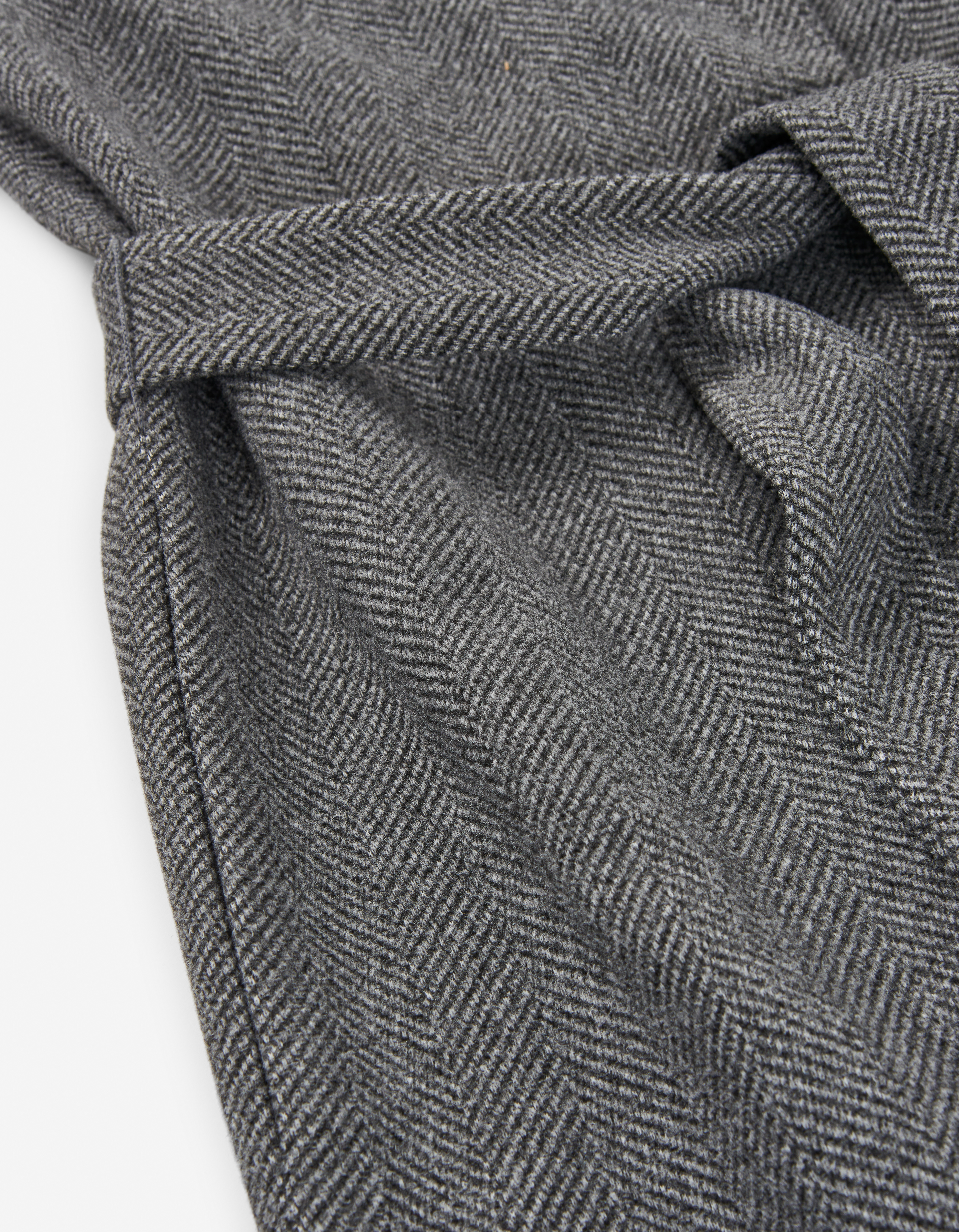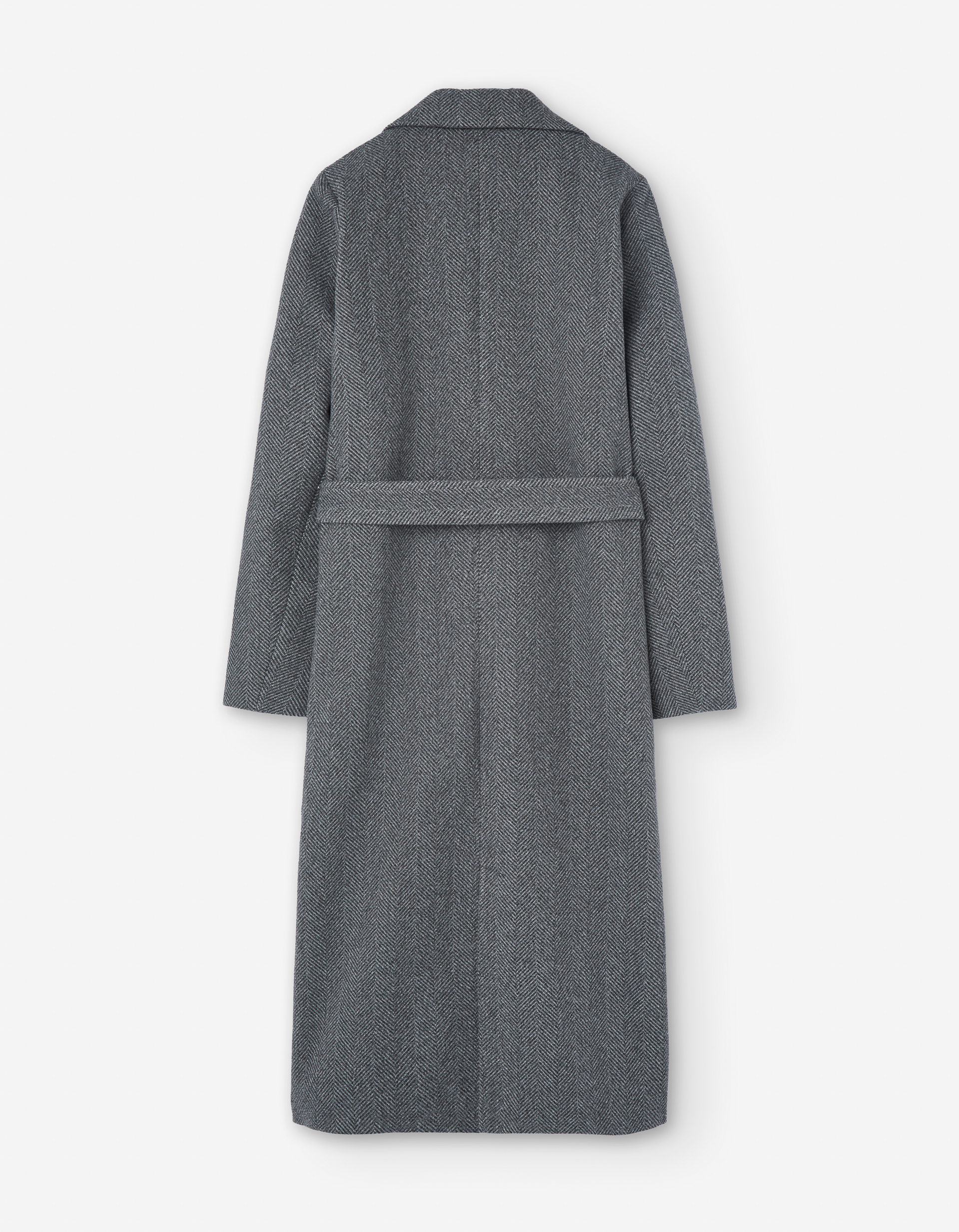 Μακρύ παλτό ψαροκόκκαλο με γιακά. Γιακάς με πέτο και μακρυά μανίκια. Μήκος που φτάνει κάτω απο το γόνατο. Αποσπώμενη ζώνη από το ίδιο ύφασμα, φοδραρισμένο. δύο πλαϊνές τσέπες και ζώνη στο ίδιο ύφασμα όπου δένει και δημιουργεί μεσάτο αποτέλεσμα.